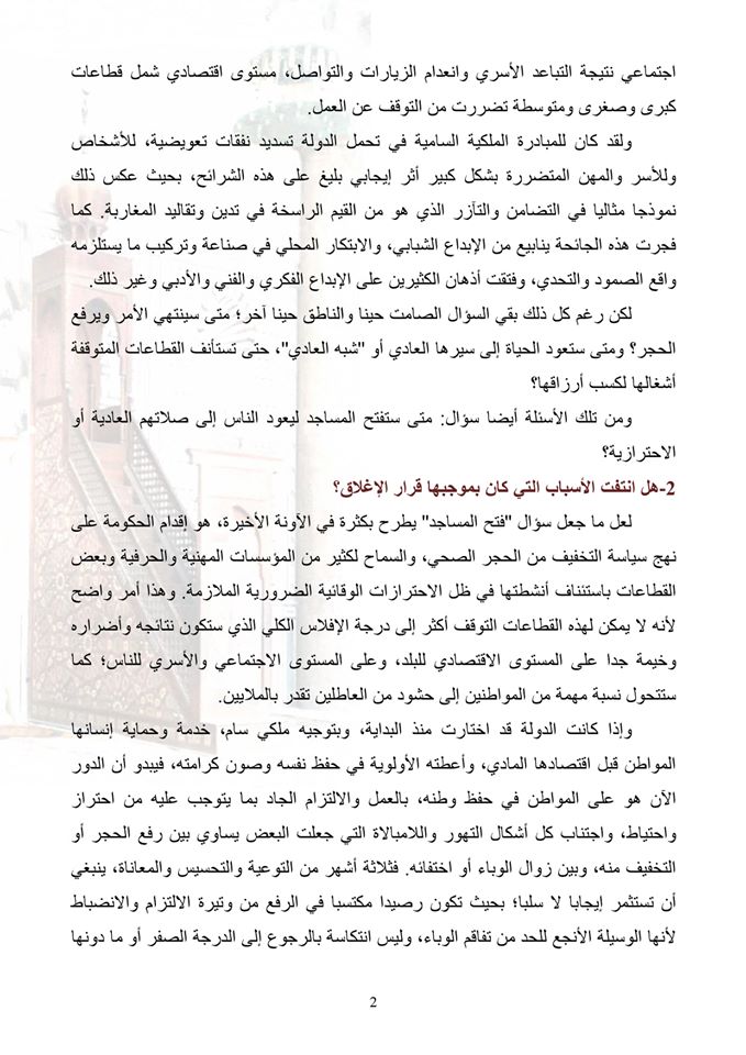 لكن رغم ذلك، تضيف الورقة، بقي السؤال صامتا حينا وناطقا حينا آخر، متى سينتهي الأمر ويرفع الحجر؟ ومتى ستعود الحياة إلى سيرها العادي أو شبه العادي، حتى تستأنف القطاعات المتوقفة أشغالها لكسب أرزاقها؟ ومن تلك الأسئلة أيضا سؤال: متى ستفتح المساجد ليعود الناس إلى صلاتهم العادية أو الاحترازية؟
