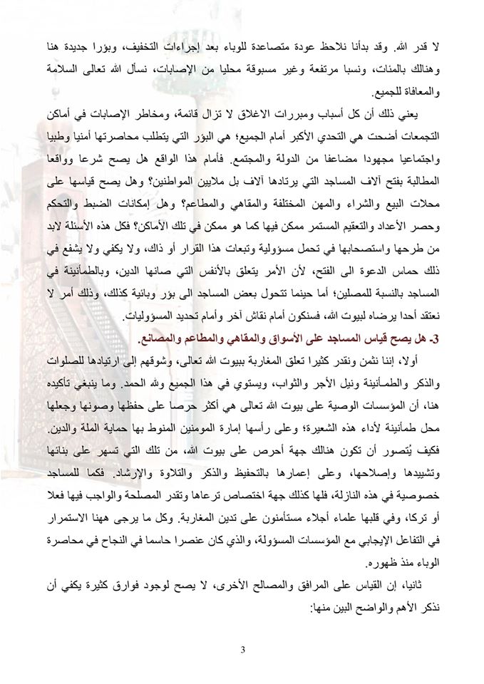 المجالس العلمية اعتبرت بأن أسباب ومبررات إغلاق المساجد لا تزال قائمة، ومخاطر الإصابة في أماكن التجمعات أضحت هي التحدي الأكبر أمام الجميع، وهي البؤر التي يتطلب محاصرتها أمنيا وطبيا واجتماعيا مجهودا مضاعفا من الدولة والمجتمع.