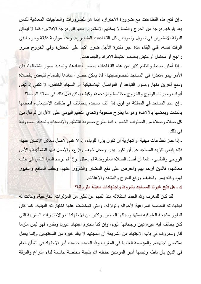 وقالت الورقة ”منذ بداية جائحة كورونا اتخذت المملكة المغربية إجراءات احترازية مبكرة بإشراف وتوجيه ملكي سامي، كان محط تقدير وتنويه عالمي، ومن بين الاحترازات إغلاق المساجد بفتوى من لجنة الإفتاء بالمجلس العلم الأعلى، بناء على طلبها من رئيس المجلس مولانا أمير المؤمنين حفظه الله واعز أمره”.