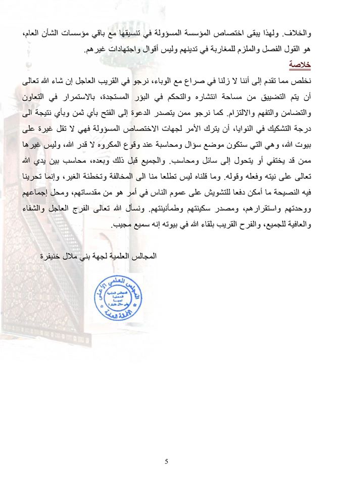 كلام فارغ. يحمل في طياته كثير من المغالطات الشرعية و العقلية يصعب حصرها.فالدين يشكل آخر إهتمامات أهل الإختصاص. و المساجد هي أقل الأماكن عرضة للعدوى. فالمصلون هم أطهر و أنقى من في المجتمع. و لا يدخلون المسجد إلا بعد الوضوء و الطهارة. و الصلاة وقت إقامتها لا يتعدى عشرة دقائق (أما المقاهي و المتاجر و الحمامات فقد يتعدى ذلك الوقت بكثير).كما أن الدول التي كانت الإصابات كثيرة(أوروبا و أمريكا… ليس فيها مساجد كثيرة كالمغرب. كما أن مجالسهم هذه ليست لها الإستقلالية في إتخاذ القرار أو قوله. ولا تتبع المصلحة الشرعية المقصودة. بل تتبع ما يأتيها من خطابات م مذكرات. فلا داعي للكذب على أنفسكم و على الناس.