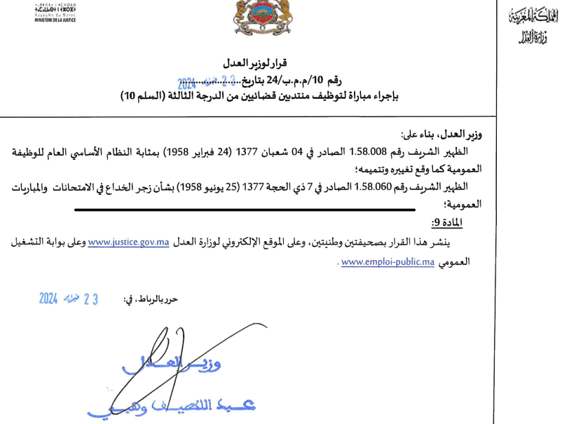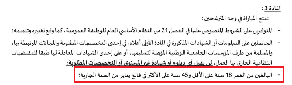 غير أن قرار وزير العدل رقم 10/م م ب/24 بتاريخ 23 فبراير 2024 أكد في مادته الثالثة على أن المباراة مفتوحة فقط في وجه المترشحين البالغين من العمر ما بين 18 سنة و45 سنة على الأكثر في فاتح يناير من السنة الجارية (2024).