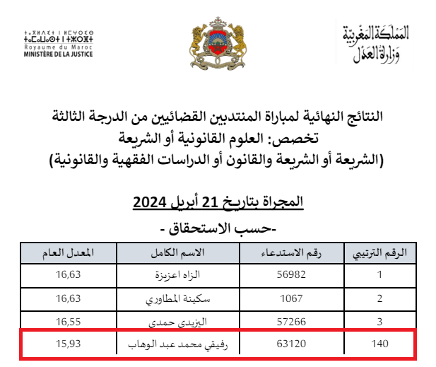 نتائج المباراة المذكورة التي تم الإفراج عنها اليوم الجمعة 17 ماي 2024 على موقع وزارة العدل تضمنت اسم محمد عبد الوهاب رفيقي، مستشار وزير العدل الحالي عبد اللطيف وهبي، الذي سبق ووقع على قرار إجراء المباراة في 23 أبريل 2024.