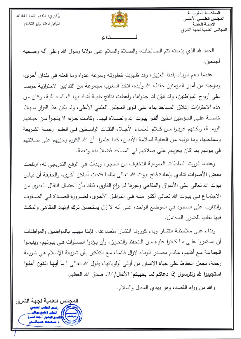 ‏وجاء في النداء “عندما دهم الوباء بلدنا العزيز وقد ظهرت خطورته وسرعة عدواهوما فعله في بلدان أخرى، وبتوجيه من أمير المؤمنين حفظه الله وأيدة اتخذ المغرب مجموعة من التدابير الاحترازية حرصا على أرواح المواطنين،وقد تبين لنا جدواها وأعطت نتائج طيبة، أشاد بها العالم قاطبة، وكان من ضمن الاحترازات إغلاق المساجد بناء على فتوى المجلس العلمي الأعلى”.