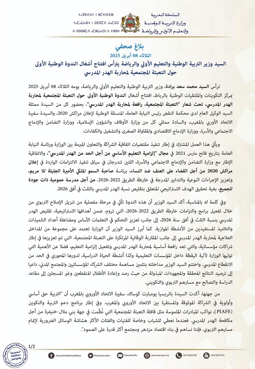 ترأس محمد سعد برادة، وزير التربية الوطنية والتعليم الأولي والرياضة، يومه الثلاثاء 08 أبريل 2025 بمركز التكوينات والملتقيات الوطنية بالرباط، افتتاح أشغال الندوة الوطنية الأولى حول التعبئة المجتمعية لمحاربة الهدر المدرسي، تحت شعار “التعبئة المجتمعية، رافعة لمحاربة الهدر المدرسي”، بحضور كل من السيدة ممثلة السيد الوكيل العام لدى محكمة النقض رئيس النيابة العامة، المنسقة الوطنية لإعلان مراكش 2020، والسيدة سفيرة الاتحاد الأوربي بالمغرب، والسادة ممثلي كل من وزارة الأوقاف والشؤون الإسلامية، ووزارة التضامن والإدماج الاجتماعي والأسرة، ووزارة الإدماج الاقتصادي والمقاولة الصغرى والتشغيل والكفاءات.