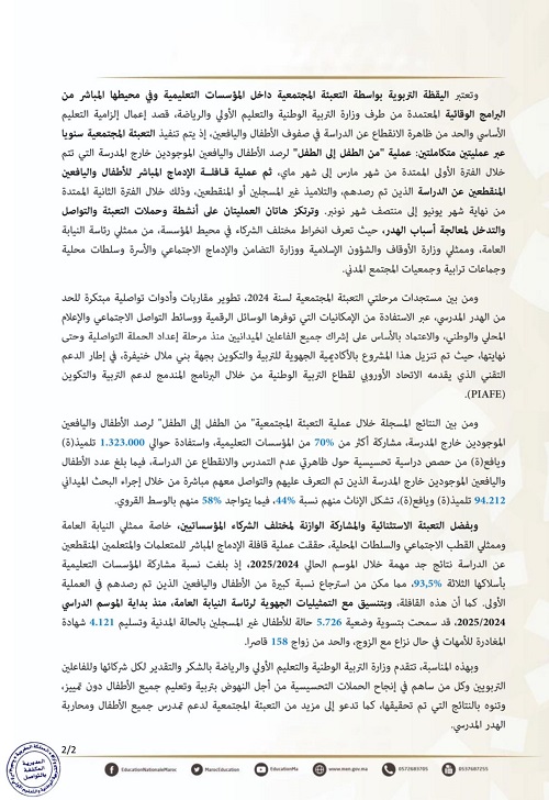 كما أبرز الوزير أن الوزارة تعتمد على مجموعة من المداخل العلاجية لمحاربة الهدر المدرسي إلى جانب المقاربة الوقائية المرتكزة على التعبئة المجتمعية، التي تم تعزيزها في إطار شراكات مؤسساتية، والتي تعد رافعة أساسية لمحاربة الهدر المدرسي وتفعيل إلزامية التعليم، فضلا عن الأهمية التي توليها الوزارة لآلية اليقظة داخل المؤسسات التعليمية وكذا أنشطة الحياة المدرسية، لدورها المحوري في الحد من الانقطاع المدرسي. واختتم السيد الوزير مداخلته بتثمين مساهمة مختلف الشركاء المؤسساتيين والمجتمع المدني، داعيا إلى ترصيد النتائج المحققة والمجهودات المبذولة من حيث رصد وإعادة الأطفال المنقطعين وغير المسجلين إلى مقاعد الدراسة والتصالح مع مسارهم التربوي والتكويني.