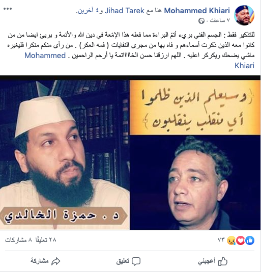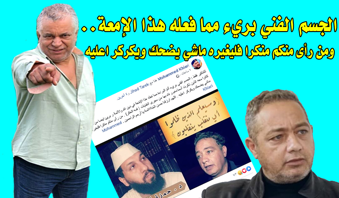 وقال محمد الخياري في تدوينة على حسابه على فيسبوك: “للتذكير فقط : الجسم الفني بريء أتم البراءة مما فعله هذا الإمعة في دين الله والأئمة وبريئ أيضا من من كانوا معه الذين ذكرت أسماءهم وفاه بها من مجرى النفايات (فمه العكر)”.