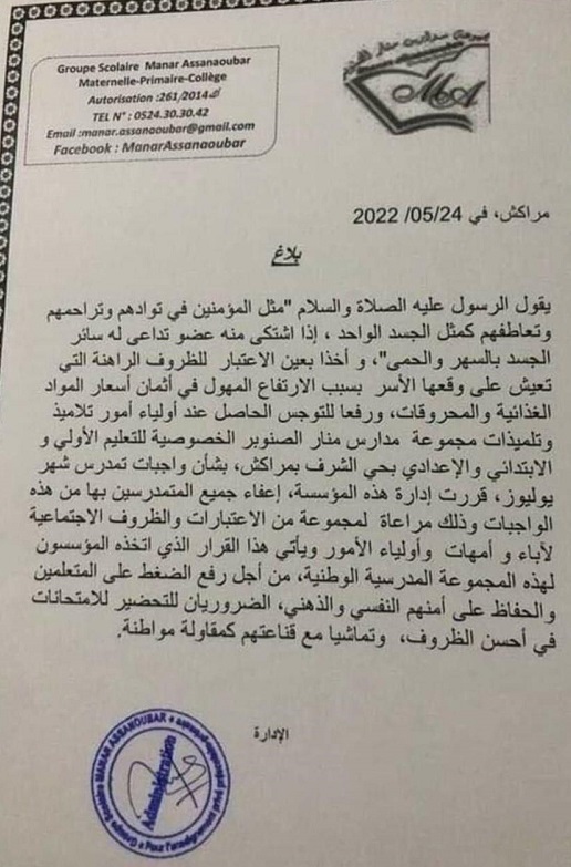 وأخذا بعين الاعتبار للظروف الراهنة التي تعيش على وقعها الأسر بسبب الارتفاع المهول في أثمان أسعار المواد الغذائية والمحروقات، ورفعا للتوجس الحاصل عند أولياء أمور تلاميذ وتلميذات مجموعة مدارس منار الصنوبر الخصوصية للتعليم الأولي والابتدائي والإعدادي بحي الشرف بمراكش، بشأن واجبات تمدرس شهر يوليوز.