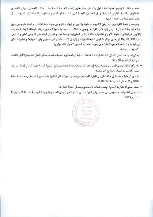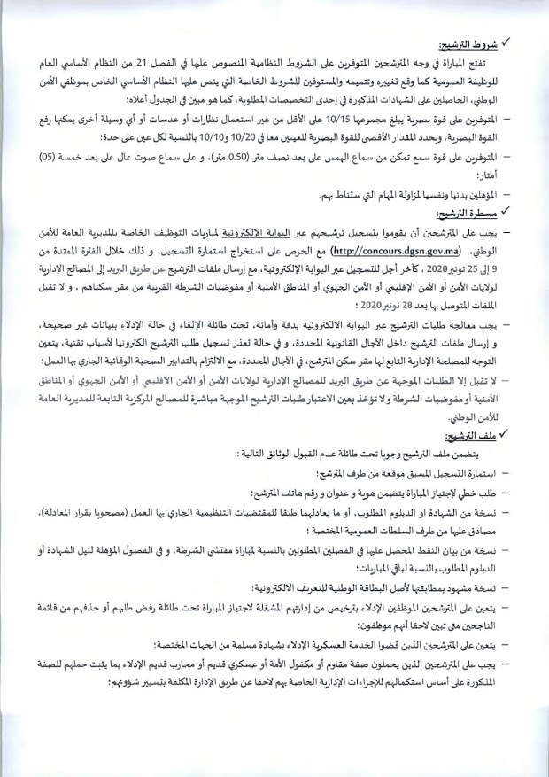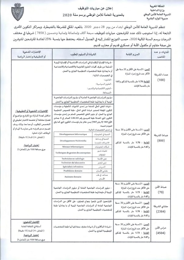 أطلقت المديرية العام للأمن الوطني اليوم الأربعاء مباراة توظيف كبيرة بعدد مناصب بلغ 7947 منصبا وستكون مفتوحة في وجه الشباب المغاربة الحاصلين على شهادة الباكلوريا فما فوق، وسيكون آخر أجل لإيداع الملفات هو: 25 نونبر 2020، كما حددت تاريخ إجراء المباراة في يوم 26 دجنبر 2020.