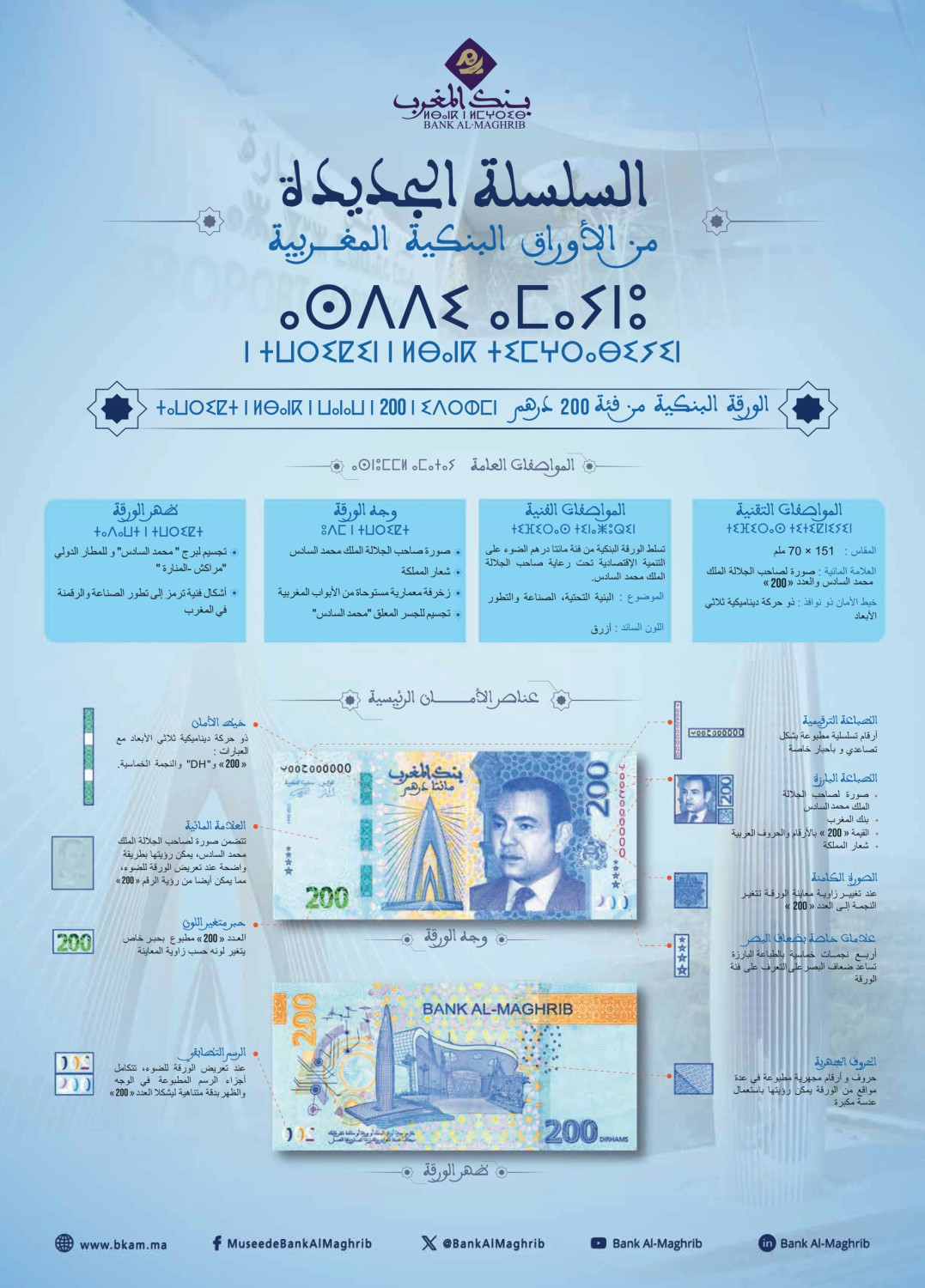 وبعد إصـدار السلسـلة الجديـدة للقطع النقديـة والورقة البنكيـة الجديدة من فئة 100 درهم، طـرح بنـك المغـرب للتـداول هذه الورقـة البنكيـة الجديـدة مـن فئــة 200 درهـم، اليوم الجمعـة، بالتزامـن مـع تخليـد الذكـرى الثمانيـن لتقديم وثيقة المطالبة بالاستقلال.