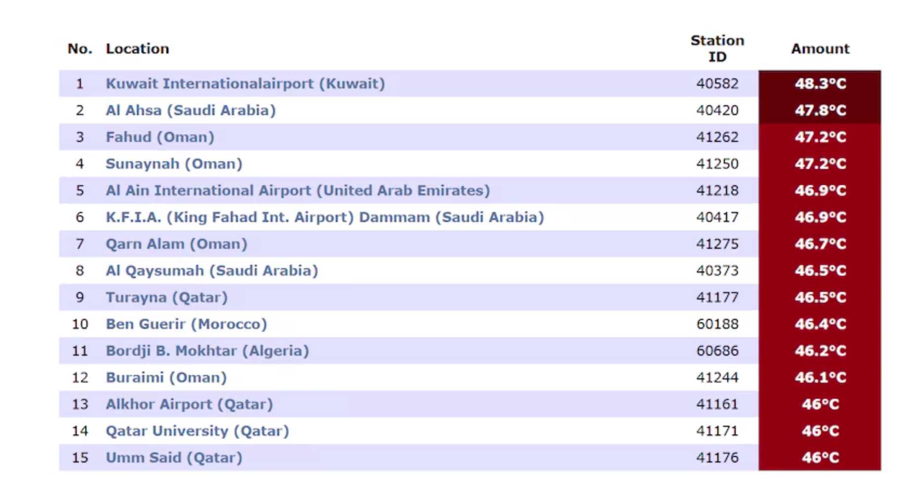 على الصعيد الدولي، تصدرت مدينة الكويت قائمة المدن الأعلى حرارة بـ48.3 درجة مئوية، تلتها الأحساء بالسعودية بـ47.8 درجة، ثم مدينة الفهود في سلطنة عمان بـ47.2 درجة مئوية.