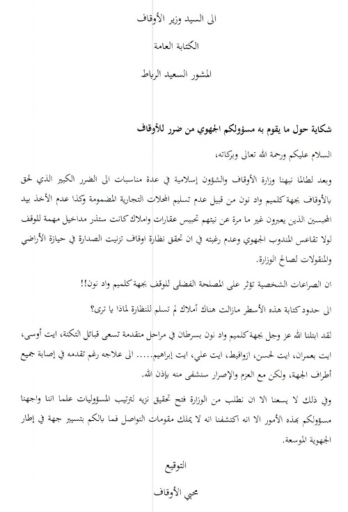 وجاء في الشكاية المعنونة بـ”شكاية حول ما يقوم به مسؤولكم الجهوي من ضرر للأوقاف”: “وبعد لطالما نبهنا وزارة الأوقاف والشؤون الإسلامية في عدة مناسبات إلى الضرر الكبير الذي لحق بالأوقاف بجهة كلميم واد نون من قبيل عدم تسليم المحلات التجارية المضمومة وكذا عدم الأخذ بيد المحبسين الذين يعبرون غير ما مرة عن نيتهم تحبيس عقارات وأملاك كانت ستذر مداخيل مهمة للوقف لولا تقاعس المندوب الجهوي وعدم رغبته في أن تحقق نظارة أوقاف تزنيت الصدارة في حيازة الأراضي والمنقولات لصالح الوزارة”.