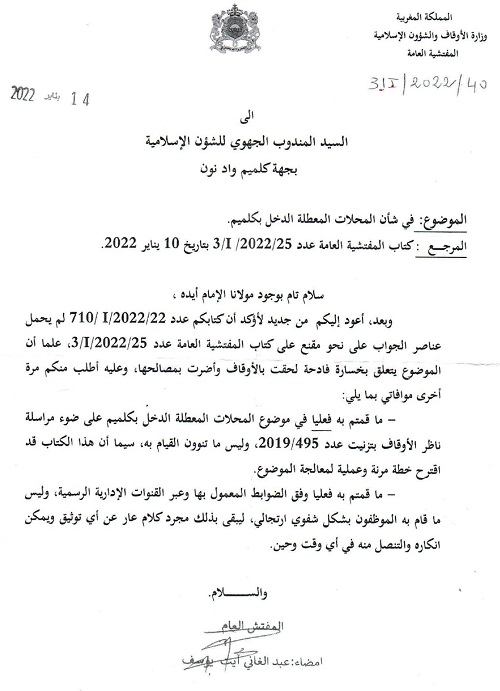 ووثيقة أخرى هي مراسلة من المفتشية العامة لوزارة الأوقاف والشؤون الإسلامية لنفس المندوب الجهوي، في شأن المحلات المعطلة الدخل بكلنيم: