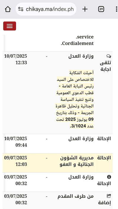 وفي خطوة موازية، أحالت وزارة العدل شكاية حول الحادث بتاريخ 9 يوليوز 2025 على رئيس النيابة العامة لاتخاذ المتعين قانونيًا.