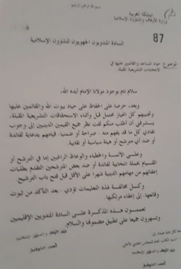 وطالب التوفيق المندوبين الجهويين للشؤون الإسلامية لفت نظر جميع القيمين الدينيين إلى وجوب تفادي كل ما قد يفهم منه، صراحة أو ضمنيا، قيامهم بالدعاية، لفائدة أو ضد، أي مرشح أو هيئة سياسية أو نقابية.