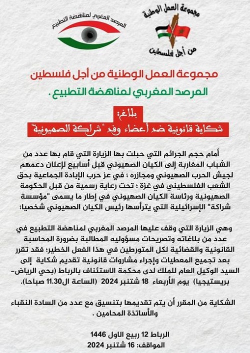 وتعليقا على الخبر ورد في بيان للمرصد المغربي لمناهضة التطبيع “أمام حجم الجرائم التي حبلت بها الزيارة التي قام بها عدد من الشباب المغاربة إلى الكيان الصهيوني قبل أسابيع “لإعلان دعمهم لجيش الحرب الصهيوني ومجازره”؛ في عز حرب الإبادة الجماعية بحق الشعب الفلسطيني في غزة؛ تحت رعاية رسمية من قبل الحكومة الصهيونية ورئاسة الكيان الصهيوني في إطار ما يسمى “مؤسسة شراكة” الإسرائيلية التي يترأسها رئيس الكيان الصهيوني شخصيا؛ وهي الزيارة التي وقف عليها المرصد المغربي لمناهضة التطبيع في عدد من بلاغاته وتصريحات مسؤوليه المطالبة بضرورة المحاسبة القانونية والقضائية لكل المتورطين في هذا الفعل الخطير؛ فقد تقرر بعد تجميع المعطيات وإجراء مشاورات قانونية تقديم شكاية إلى السيد الوكيل العام للملك لدى محكمة الاستئناف بالرباط (بحي الرياض-بريستيجيا) يوم الأربعاء 18 شتنبر 2024 (الساعة الـ11.30 صباحا)”.