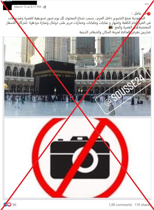 وفي التفاصيل، ذكر منشور متداول على نطاق واسع على مواقع فيسبوك وإنستغرام وتويتر: “السعودية تمنع التصوير داخل الحرم المكي”.