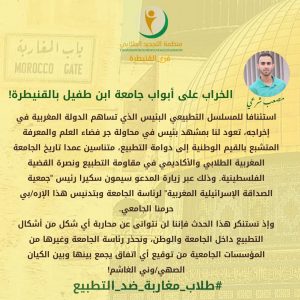 وقال مصعب شرعي، عضو اللجنة التنفيذية ل”منظمة التجديد الطلابي”، أنه “استئنافا للمسلسل التطبيعي البئيس الذي تساهم الدولة المغربية في إخراجه، تعود لنا بمشهد بئيس في محاولة جر فضاء العلم والمعرفة المتشبع بقيم الوطنية إلى دوامة التطبيع، متناسين عمدا تاريخ الجامعة المغربية الطلابي والأكاديمي في مقاومة التطبيع ونصرة القضية الفلسطينية”.