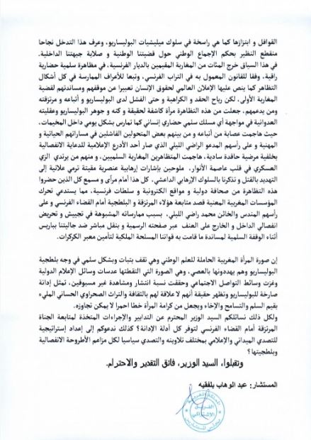 ودعا بلفقيه الوزارات المعنية بالجالية لإعادة الإستراتيجية في تعاملها مع الأحداث، وعن مدى استعدادها للتصدي الميداني والإعلامي بمختلف التلاوين لكل المزاعم والأطروحات الأنفصالية وبلطجيتها.