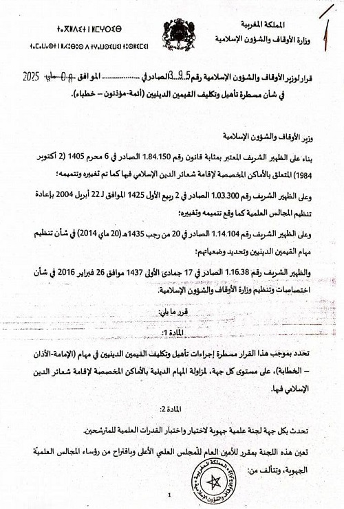 “قرار وزير الأوقاف والشؤون الإسلامية رقم 3.95 الصادر في 2025 في شأن مسطرة تأهيل وتكليف القيمين الدينين (أئمة-مؤذنون-خطباء).