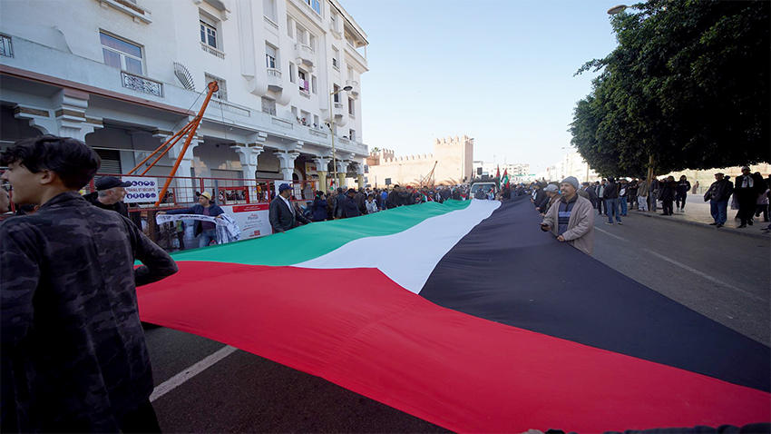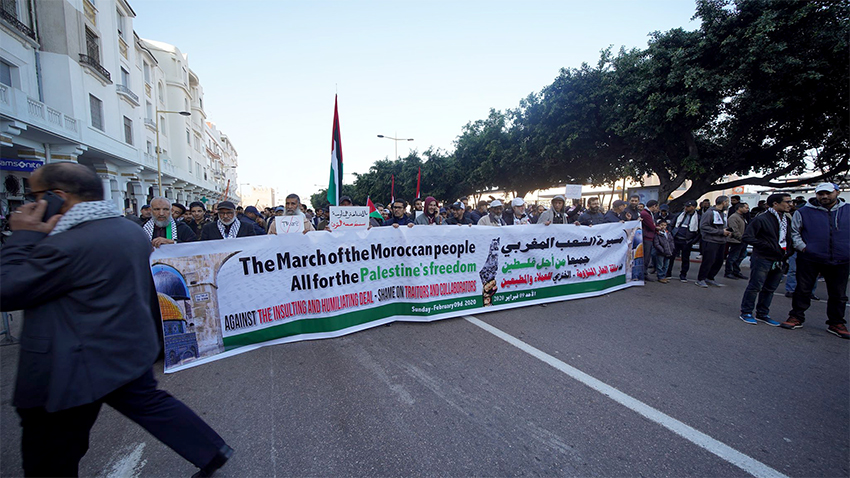 وشهدت المسيرة الضخمة التي كانت انظلاقتها من باب الحد المعروف في العاصمة الرباط، في اتجاه مقر البرلمان المغربي، ترديد شعارات رافض لـ “صفقة القرن” وحمل شعارات من قبيل: “جميعا من أجل تحرير فلسطين.. ضد صفقة العار المشؤومة”.