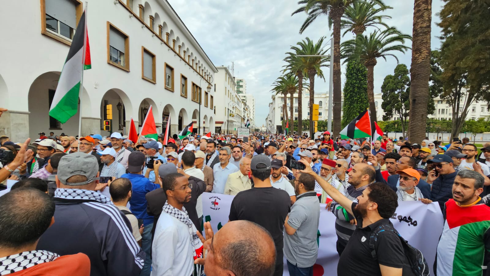 تجمع الآلاف من المغاربة صباح اليوم الأحد 15 أكتوبر 2023 بالعاصمة الرباط في مسيرة لدعم الشعب الفلسطيني وحركة المقاومة الإسلامية “حماس” في حربها ضد الاحتلال الصهيوني ورفضا للعدوان على قطاع غزة المحاصر.