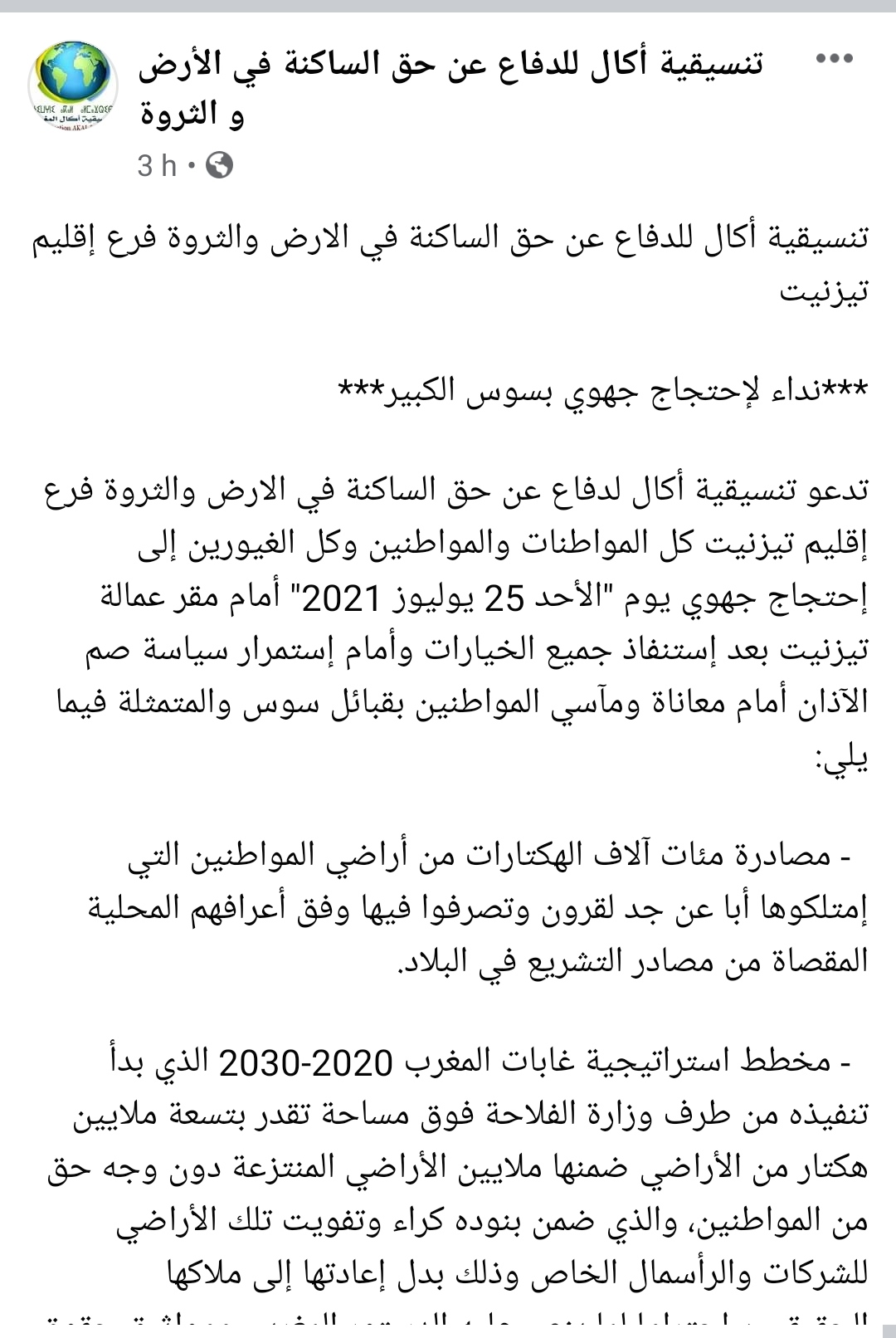 وأشارت التنسيقية في نداء لها إلى معاناة المواطنين بجهة سوس من مصادرة مئات آلاف الهكتارات من أراضيهم التي امتلكوها أبا عن جد لقرون، وتصرفوا فيها وفق أعرافهم المحلية المقصاة من مصادر التشريع في البلاد.