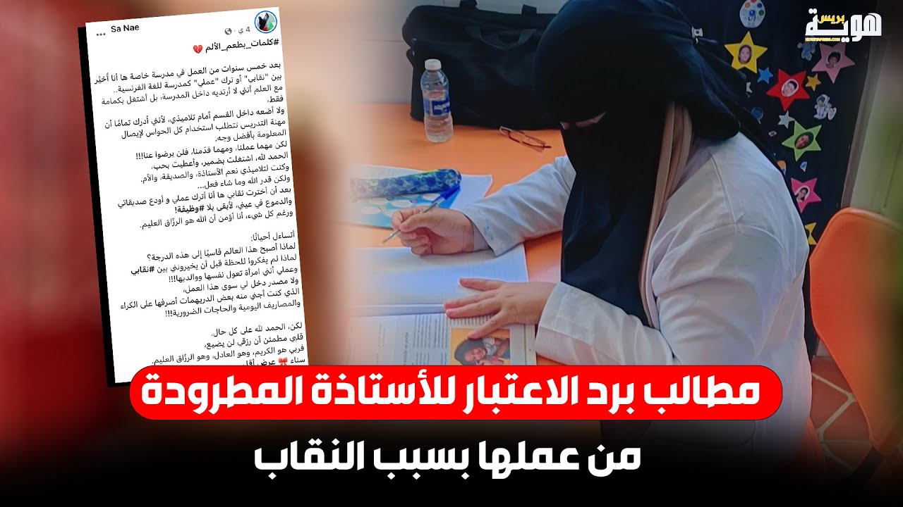 فيديو.. مطالب برد الاعتبار للأستاذة المطرودة من عملها بسبب النقاب