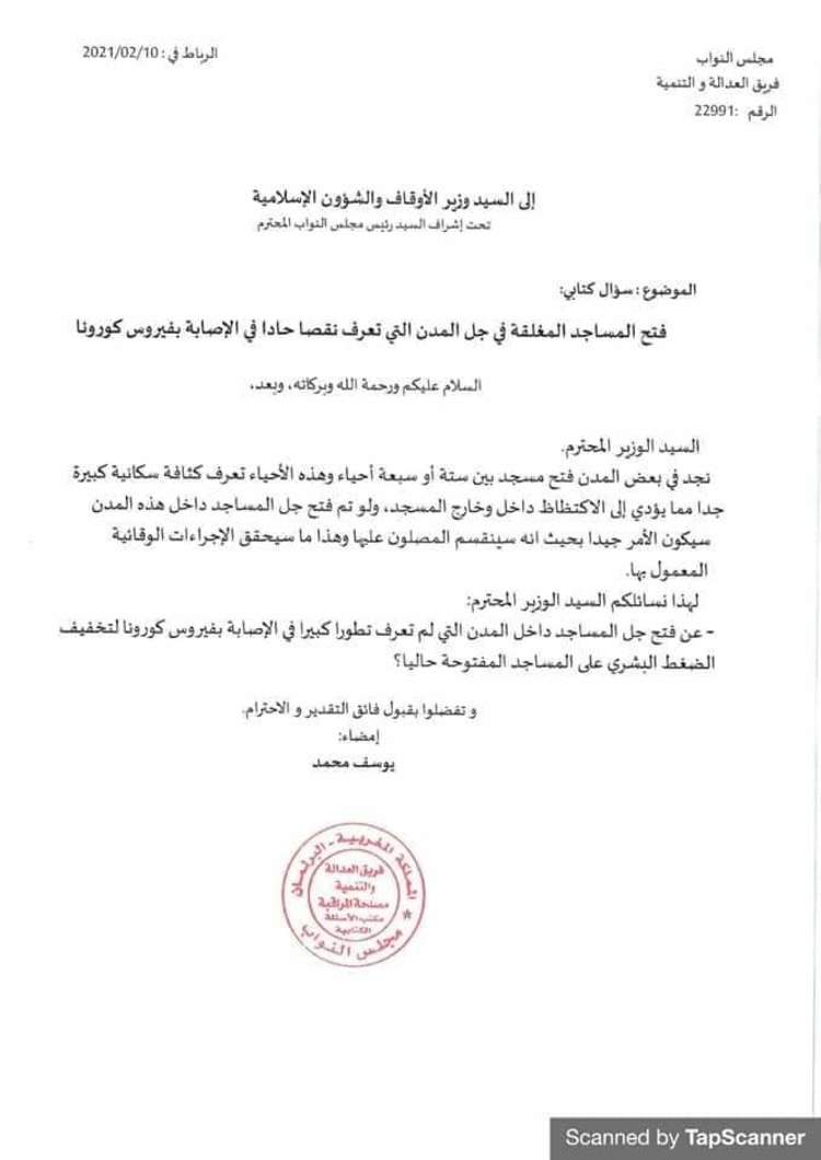 طالب يوسف محمد، النائب البرلماني بفريق العدالة والتنمية بمجلس النواب، وزير الأوقاف والشؤون الاسلامية، احمد التوفيق، بفتح جل المساجد بالمدن التي تعرف نقصا حادا في الاصابة بفيروس كورونا.