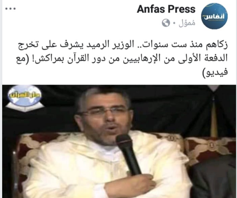 الجريدة المعروفة بعدائها الكبير للمشتغلين بالمجال الدعوي الديني، كتبت تحت عنوان “زكاهم منذ ست سنوات.. الوزير الرميد يشرف على تخرج الدفعة الأولى من الإرهابيين من دور القرآن بمراكش!” بأن مصطفى الرميد، وزير العدل السابق، وبعد ست سنوات، منذ تزكيته “لدور القرآن بمراكش وتشرف بزيارتها ومبايعته للمشرفين على “الإمارة المغراوية”، ها هي هذه الدور تخرج الدفعة الأولى من “إرهابييها” الدمويين ليذبحوا السائحتين الإسكندفايتين في دجنبر 2018″.