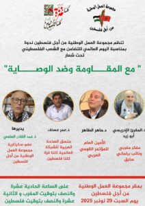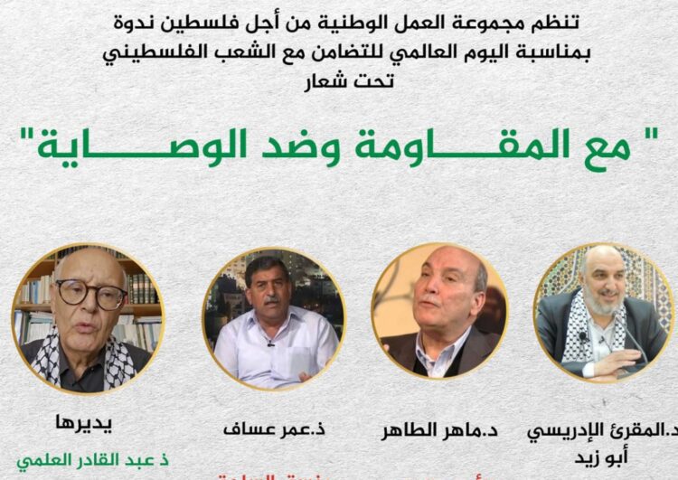 تنظم مجموعة العمل الوطنية من أجل فلسطين ندوة بمناسبة اليوم العالمي للتضامن مع الشعب الفلسطيني تحت شعار: “مع المقاومة وضد الوصاية”.