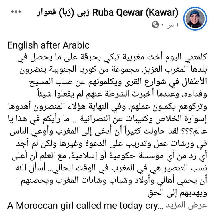 اشتكت مواطنة مغربية من مجموعة من كوريا الجنوبية رصدتها تباشر حملات التنصير بشوارع المغرب، إذ تستهدف الأطفال الذين يلعبون في الأزقة والشوارع بوسائل ترغيبية لا حصر لها.
