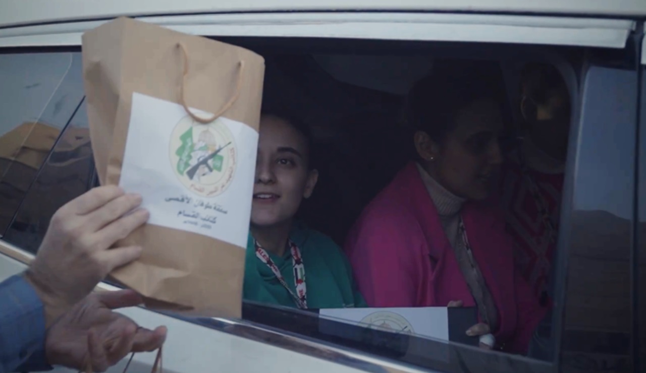 وكشفت مشاهد بثتها كتائب القسام، توثق لحظة الإفراج عن الأسيرات، منح عناصر القسام للأسيرات حقائب صغيرة، وأظهرت جانبًا منها، حيث احتوت على وثيقة بعنوان “قرار الإفراج عن أسير”.
