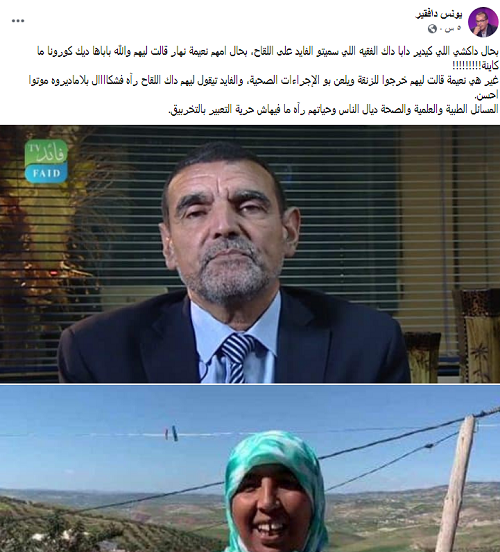تصريحات الفايد أثارت غضب رئيس تحرير يومية الأحداث المغربية، يونس دافقير، الذي وصفها بالمشابه لتصريحات “مي نعيمة”، وكتب: “بحال داكشي اللي كيدير دابا داك الفقيه اللي سميتو الفايد على اللقاح، بحال امهم نعيمة نهار قالت ليهم والله باباها ديك كورونا ما كاينة!!!!!!!!!