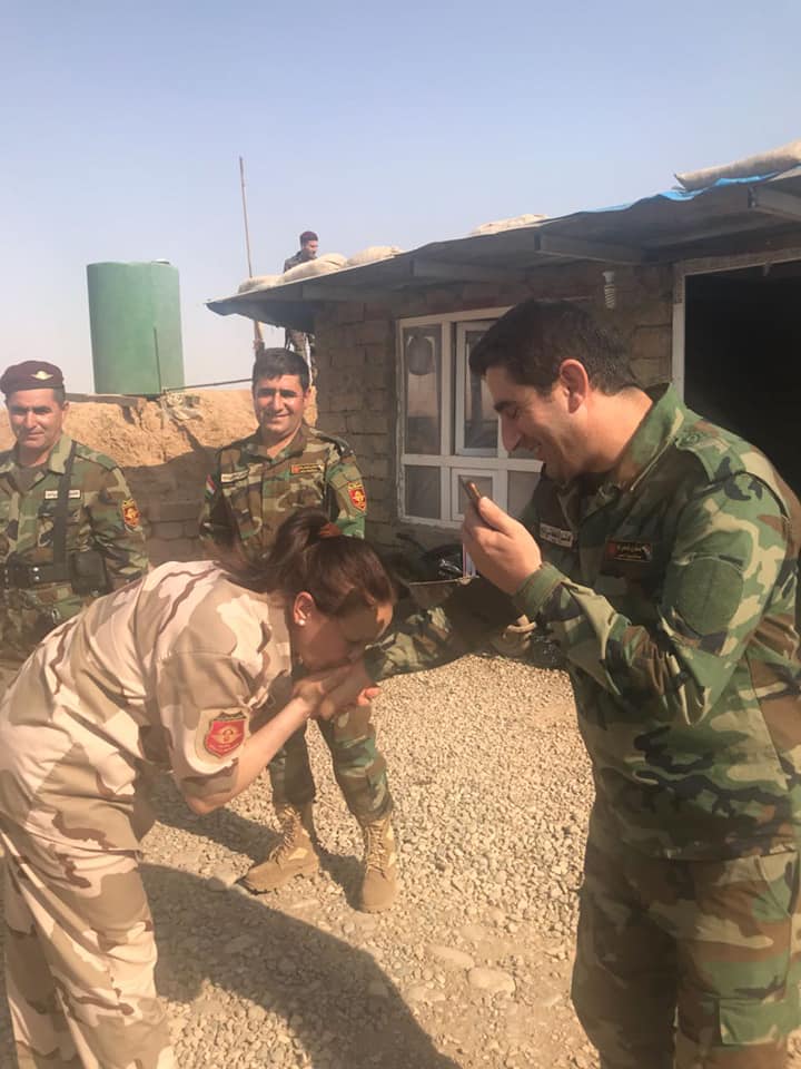 وأرفقت مزان صور تقبيلها لأيادي مقاتلي “البشمركة”، بتعليق قالت فيه: “أنا أقوم بزيارة تفقدية لقوات البيشمركة في جبهات القتال كنت أصر على تقبيل أياديهم واحدا واحدا رغم رفضهم الكبير”.