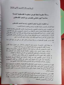 أعلن عزيز هناوي، الكاتب العام للمرصد المغربي لمناهضة التطبيع، على حائطه فيسبوك، “زيارة وفد ممثل عن أكثر من 55 هيئة التنظيمات الشعبية المغربية للسفير الفلسطيني بالرباط، يومه الإثنين، لتسليم رسالة إلى الشعب الفلسطيني وفصائله، تأكيدا لموقف الشعب المغربي من القضية الفلسطينية، ودعوة للاستمرار في الوحدة الوطنية الفلسطينية لمواجهة الاحتلال الصهيوني ومشاريع التصفية”.