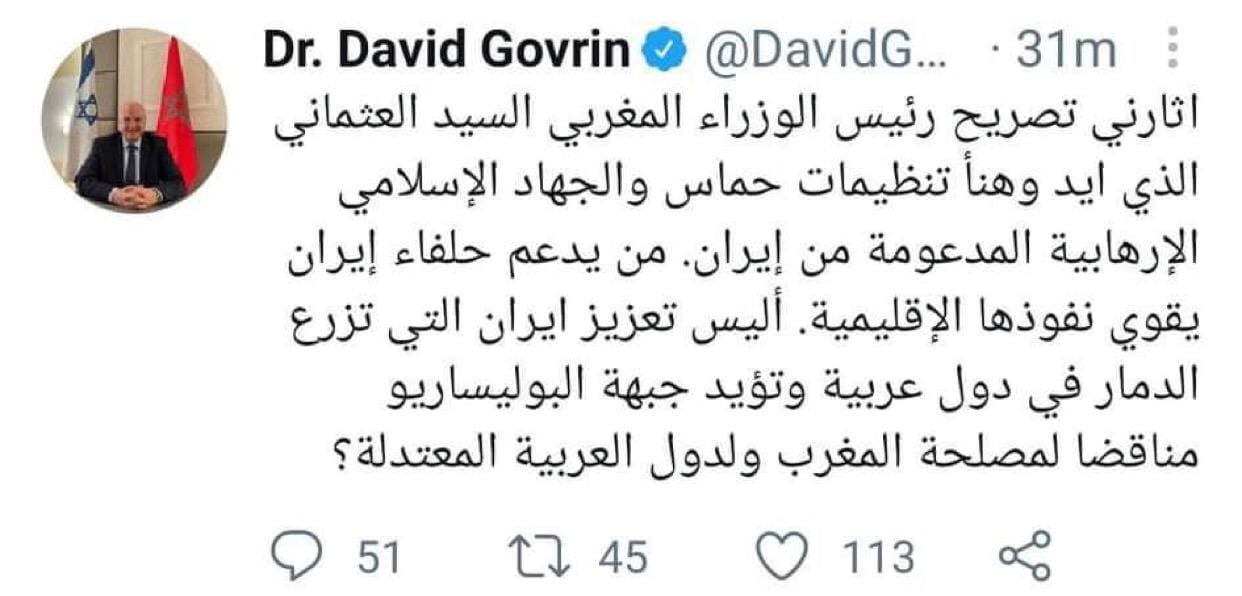 هاجم المسؤول عن مكتب الاتصال “الصهيوني” بالرباط، دافيد غوفرين، رئيس الحكومة والأمين العام لحزب العدالة والتنمية سعد الدين العثماني، بسبب رسالة التهنئة التي وجهها للشعب الفلسطيني وفصائل المقاومة بـ”الانتصار” على العدوان الإسرائيلي.