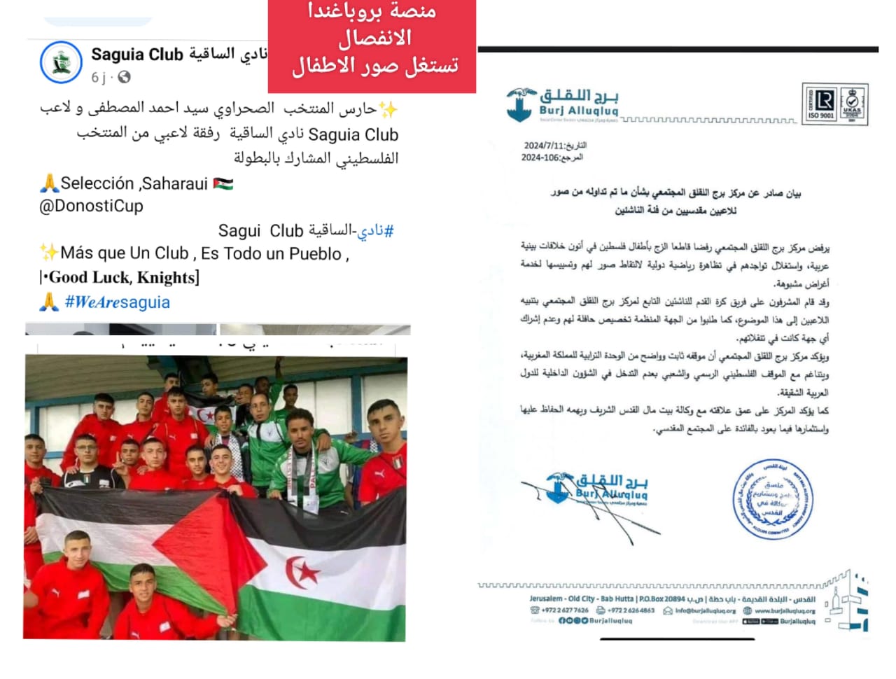 ونشر “نادي الساقية” التابع للجبهة الانفصالية على صفحته على فيسبوك صورة تجمع بين لاعبين من النادي المذكور مع اللاعبين المقدسيين وهم يحملون “خرقة” البوليساريو إلى جانب العلم الفلسطيني.