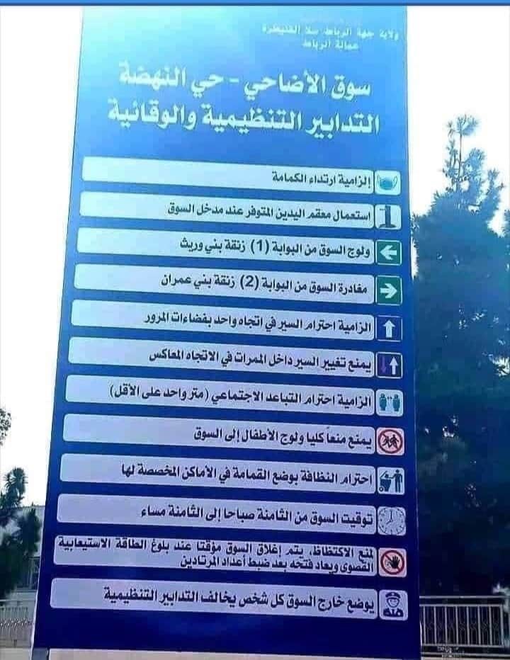 هذا وقد وُضعت على أبواب الأسواق لوحات من أجل التوعية وأخذ الاحترازات اللازمة لعدم انتقال الوباء.