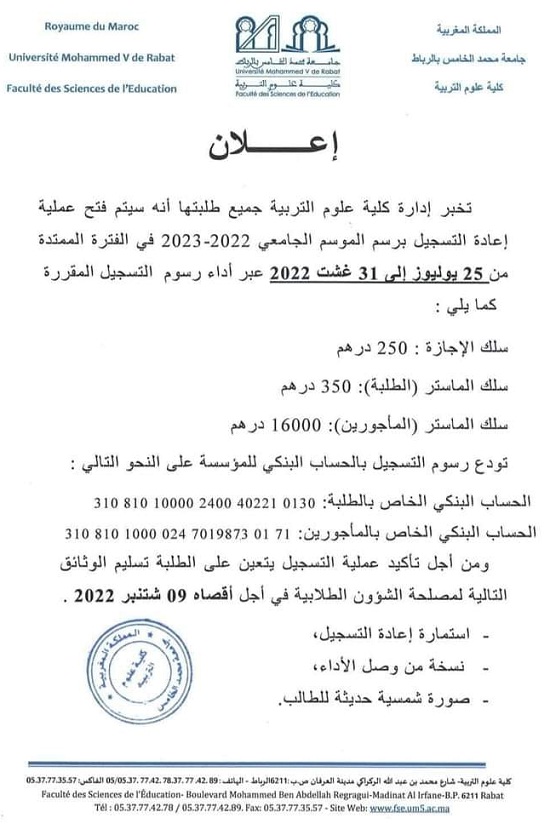 فقد جاء في إعلان كلية علوم التربية جامعة محمد الخامس الرباط، “أن الإدارة تخبر جميع طلبتها أنه سيتم فتح عملية إعادة التسجيبل برسم الموسم الجامعي 2022-2023 في الفترة الممتدة من 25 يوليوز إلى 31 غشت 2022 عبر أداء رسوم التسجيل المقررة كما يلي: