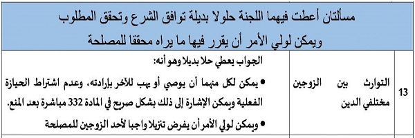 تحت عنوان “من مسائل مدونة الأسرة المقترحة.. التوارث بين الزوجين مختلفي الدين”، كتب الدكتور رشيد بنكيران “من القضايا التي أبدت لجنة الفتوى بالمجلس العلمي الأعلى رأيها فيها، مسألة تحمل الرقم (13) في الجدول الذي نشرته وزارة الأوقاف والشؤون الإسلامية على موقعها الرسمي، كما يظهر في الصورة أدناه. وتتعلق هذه المسألة بحكم “التوارث بين الزوجين مختلفي الدين””.