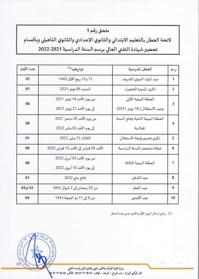 نشرت وزارة التربية الوطنية، اللائحة الرسمية للعطل المدرسية الخاصة بالتعليم الابتدائي والإعدادي والثانوي التاهيلي، وأقسام التحضير لشهادة التقني العالي، برسم الموسم الدراسي 2021 ـ 2022.