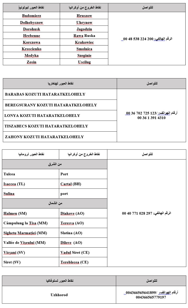 وفي ما يلي جدول يوضح نقاط العبور البرية التي بإمكان مغاربة أوكرانيا استعمالها في أربع بلدان أوربية: