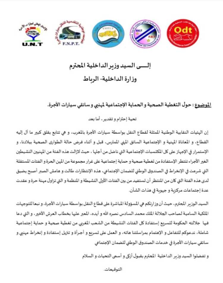 ودعا المصدر ذاته، وزير الداخلية للتفاعل وتسريع أجرأة استفادة وانخراط مهنيي وسائقي سيارات الأجرة من خدمات الصندوق الوطني للضمان الاجتماعي.