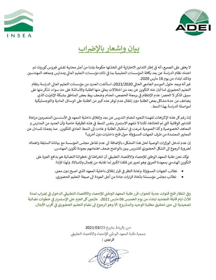 وفي هذا الصدد، قرر طلبة المعهد الوطني للاحصاء والاقتصاد التطبيقي بالرباط، الالتحاق باحتجاجات طلبة المعهد الوطني للمعلوميات وتحليل النظم، إذ أعلنوا “الدخول في إضراب لمدة ثلاثة أيام قابلة للتجديد احتجاجا على استمرار إغلاق الداخلية وتواصل كابوس التعليم عن بعد”.
