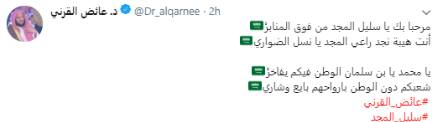 واحتفى القرني بقصيدته النبطية، ونشر سلسلة تغريدات عنها.