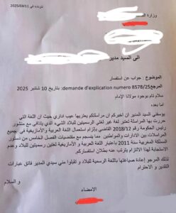 وأوضح الموظف في مراسلة إدارية موجّهة إلى مديره، حصلت الجريدة على نسخة منها، أن الوثيقة التي توصّل بها تشوبها “عيوب إدارية”، معتبراً أن استعمال اللغة الفرنسية في المراسلات الرسمية يتعارض مع منشور رئيس الحكومة رقم 12/2018، الذي يفرض اعتماد اللغتين الرسميتين للدولة في جميع المراسلات بين الإدارات والمواطنين.