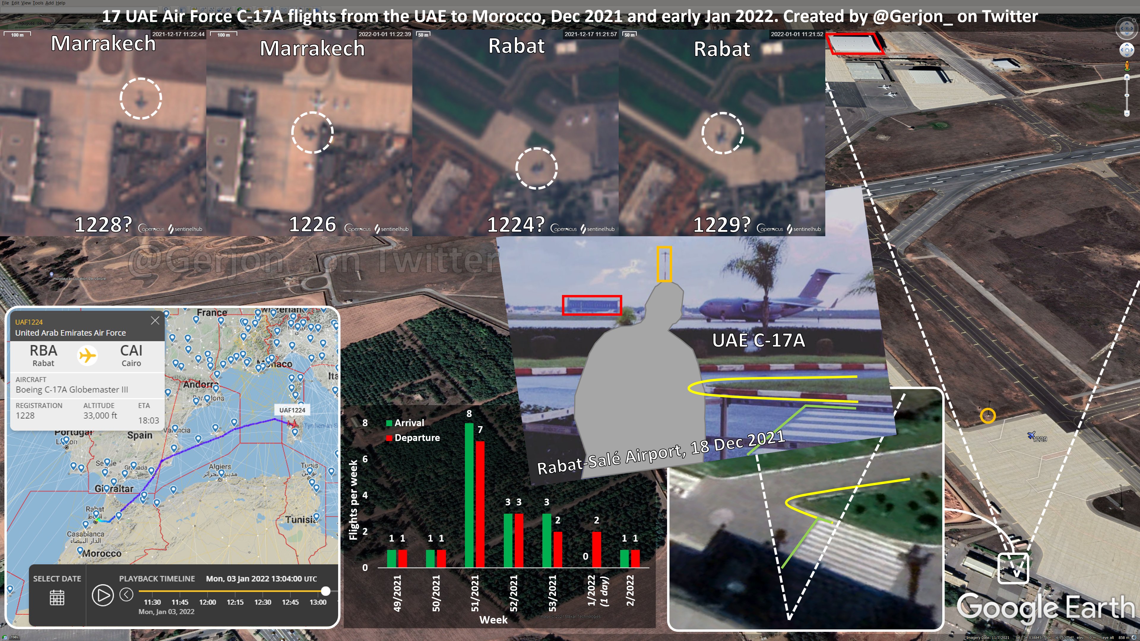 قامت طائرات عسكرية تابعة لسلاح الجو الإماراتي من طراز C-17s و A330-MRTTs، بما لا يقل عن 17 رحلة ذهابا وإيابا بين قواعدها في الإمارات والقواعد المغربية بين 1 دجنبر وأوائل يناير 2022، وفق ما نشره على تويتر حساب “جرجون” الذي يراقب الحركة الجوية في عدة مناطق من العالم.