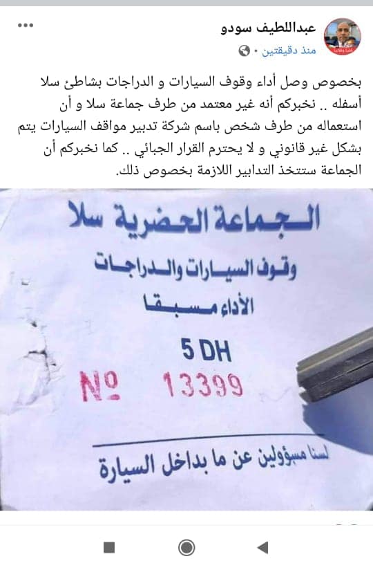 وقال سودو في تدوينته: بخصوص وصل أداء وقوف السيارات والدراجات بشاطئ سلا أسفله .. نخبركم أنه غير معتمد من طرف جماعة سلا وأن استعماله من طرف شخص باسم شركة تدبير مواقف السيارات يتم بشكل غير قانوني ولا يحترم القرار الجبائي المرفق أسفله والمعتمد من طرف المجلس البلدي والمصادق عليه من طرف السلطات.