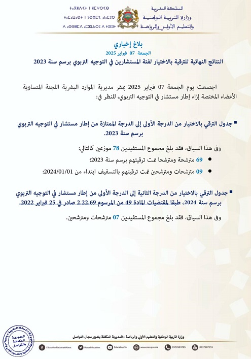 أصدرت وزارة التربية الوطنية والتعليم الأولي والرياضة نتائج الترقية بالاختيار الخاصة بفئة المستشارين في التوجيه التربوي برسم سنة 2023​.