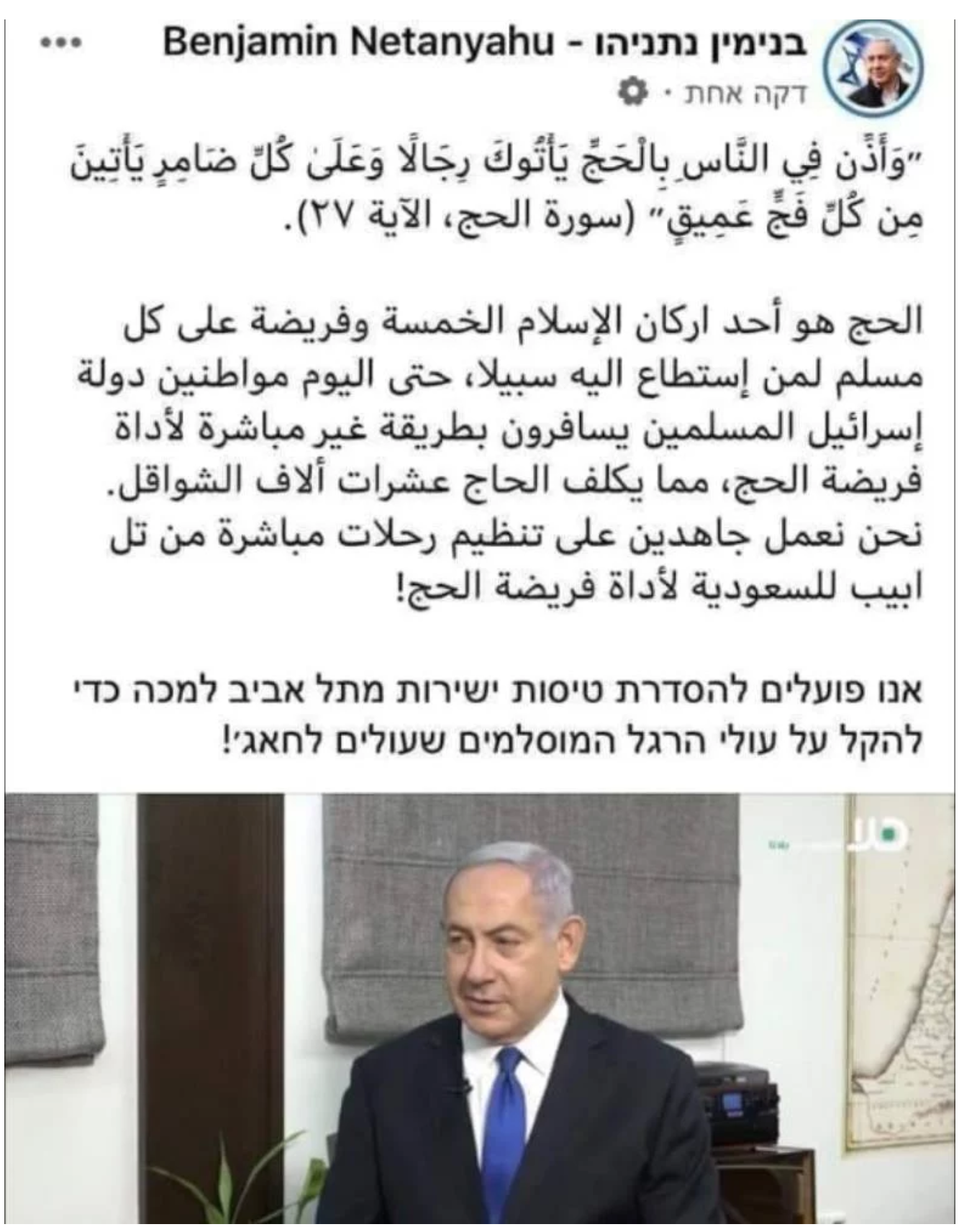 نتنياهو في منشور مثير استدل فيه بآية وحذفه من الفايس بعد دقائق: نعمل على تنظيم رحلات حج مباشرة من تل أبيب إلى مكة (صورة)